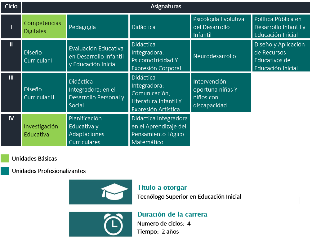 La carrera de educación inicial permita a los profesionales seleccionar las diferentes aportaciones de la teoría curricular, para la planificación, el diseño, la retroalimentación y la evaluación de las estrategias de aprendizaje, accionando proyectos e instrumentos metodológicos adaptados al contexto educativo de la educación inicial; además de relacionar experiencias de aprendizaje significativas y oportunas que favorezcan el desarrollo integral de las niñas/os, desde el contexto familiar, social y cultural. De acuerdo a la Modalidad Dual se ejecuta en dos entornos: académico en la institución educativa el 33%, y en el entorno laboral real en las entidades receptoras formadoras será del 67%.